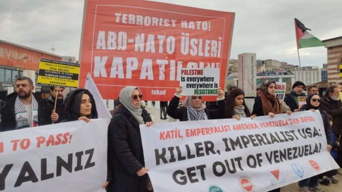 Eylemde, “Katil ABD Venezuela’dan Defol, Venezuela Halkı Yalnız Değildir, Katil ABD Katil İsrail, Emperyalistler Yenilecek Direnen Halklar Kazanacak, NATO’dan Çıkılsın Emperyalist Üsler Kapatılsın, Borular Sökülsün İşgalciler Sürülsün, Kahrolsun Amerikan Emperyalizmi, Direniş Var Yılgınlık Yok, Firavun Trump Venezuela’dan Defol, Trump’ın Değil Halkların Dostu Ol” sloganlarını attık, tekbir getirdik.